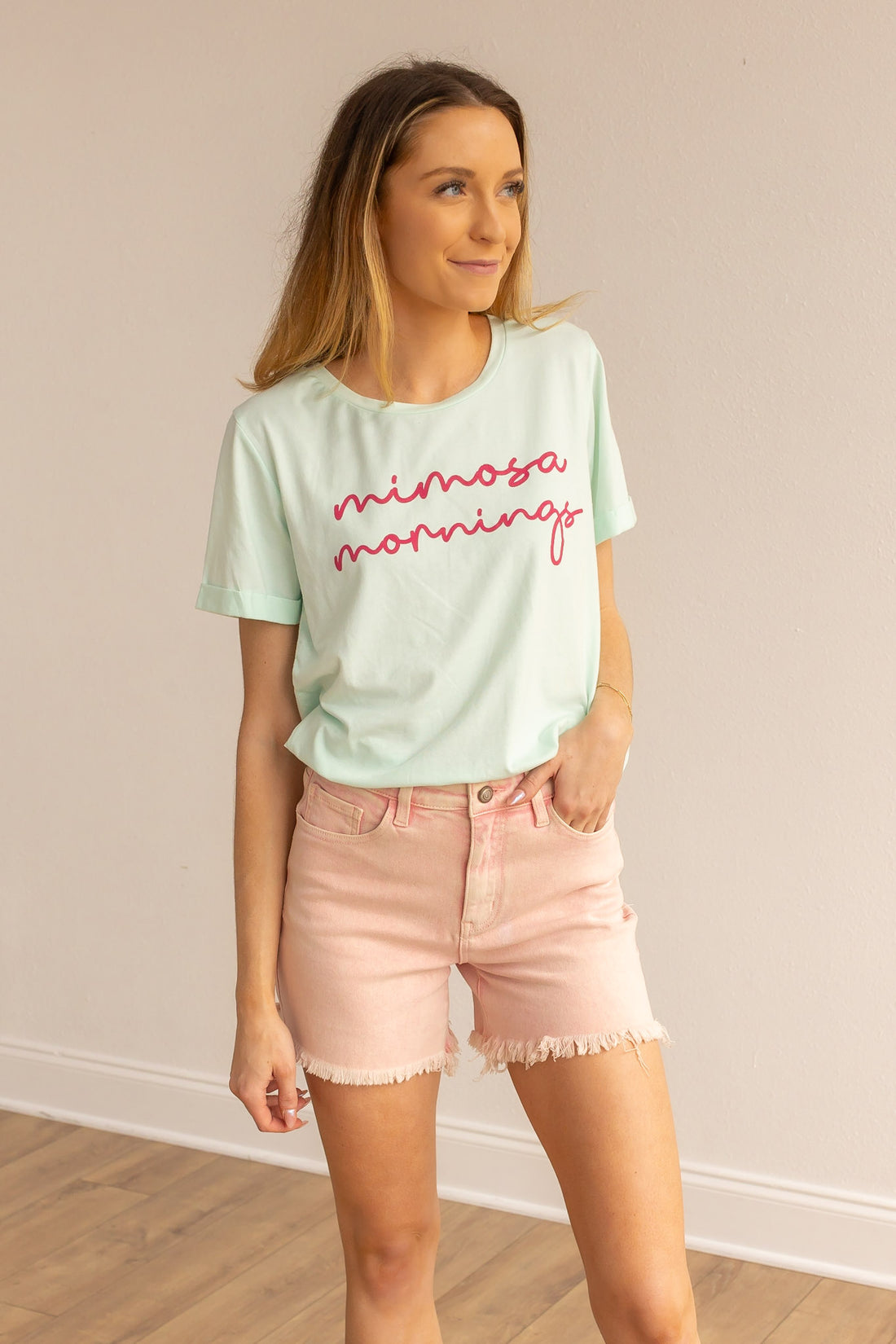 The Mimosa Mornings On Mint Cuff Tee is a stylish graphic tee that radiates a...