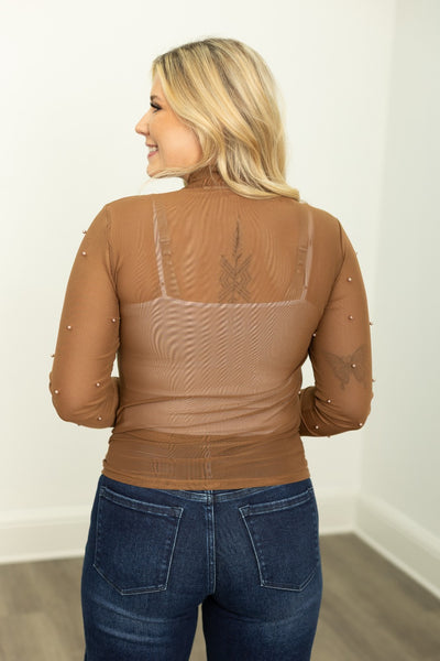 Mock Neck Mesh Top with Pearl Detail, Brown