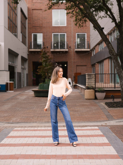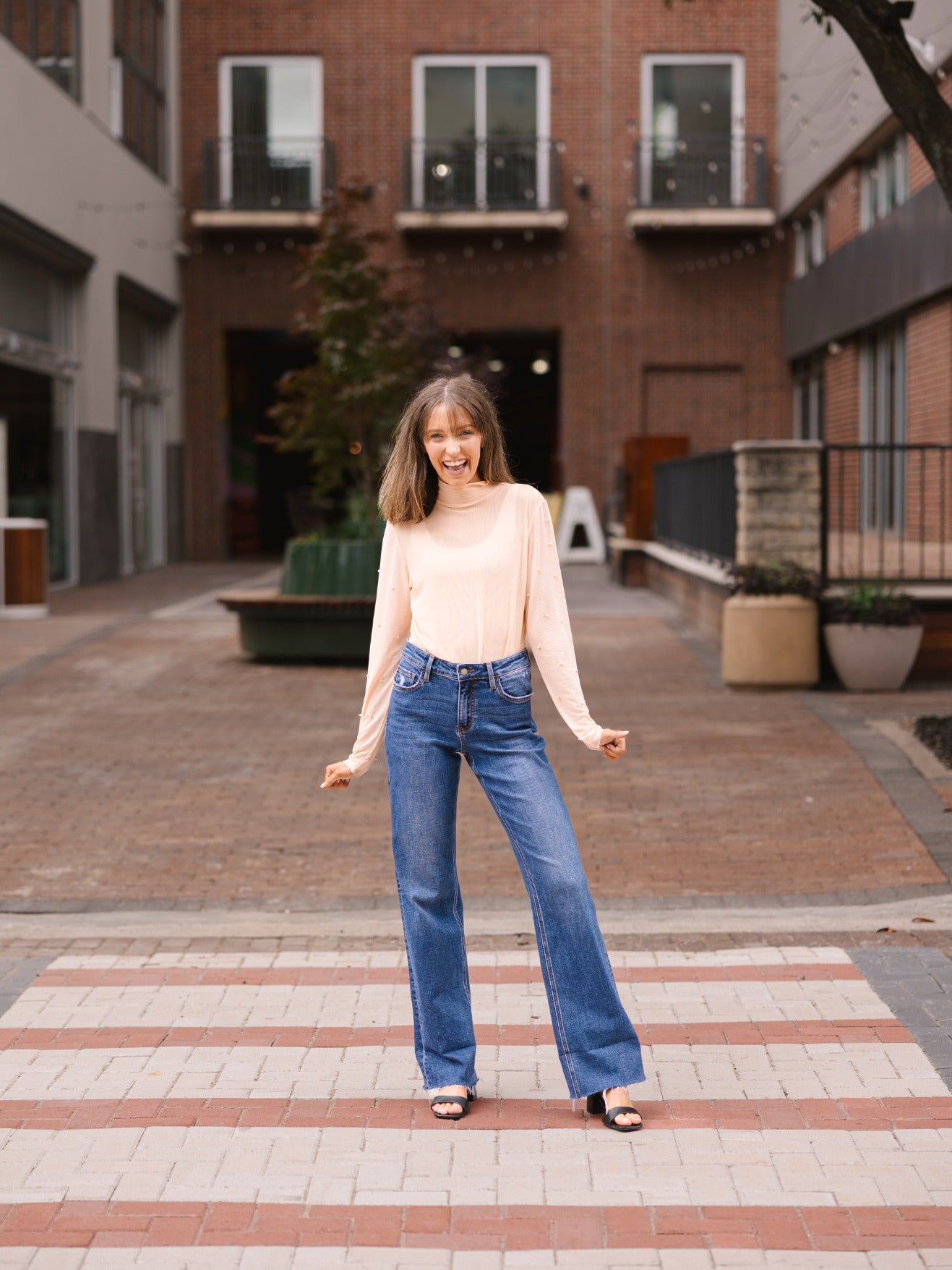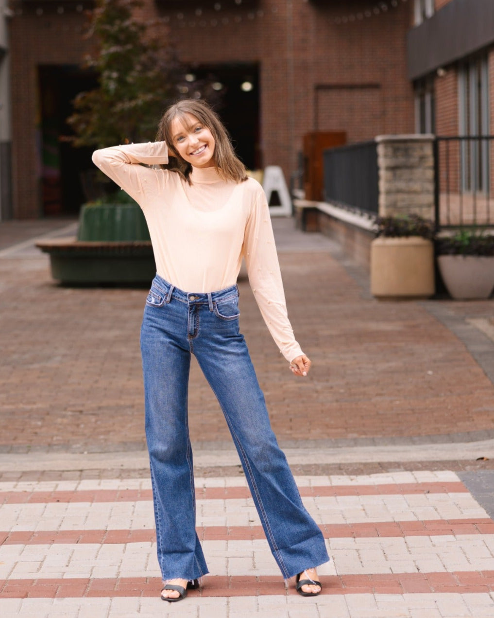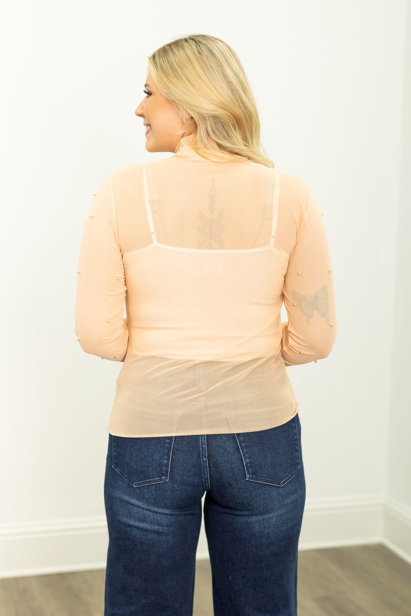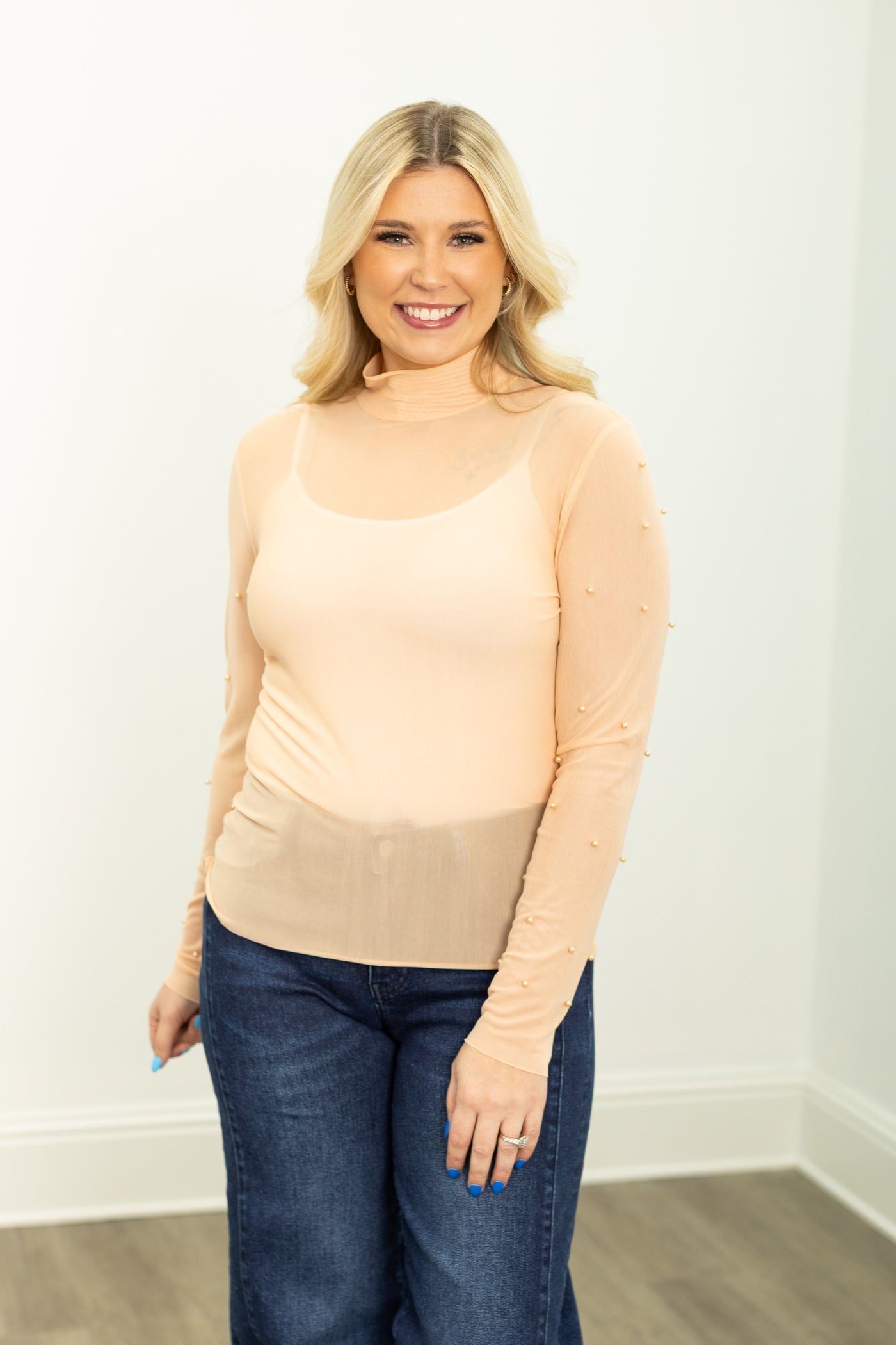 Mock Neck Mesh Top with Pearl Detail, Champagne
