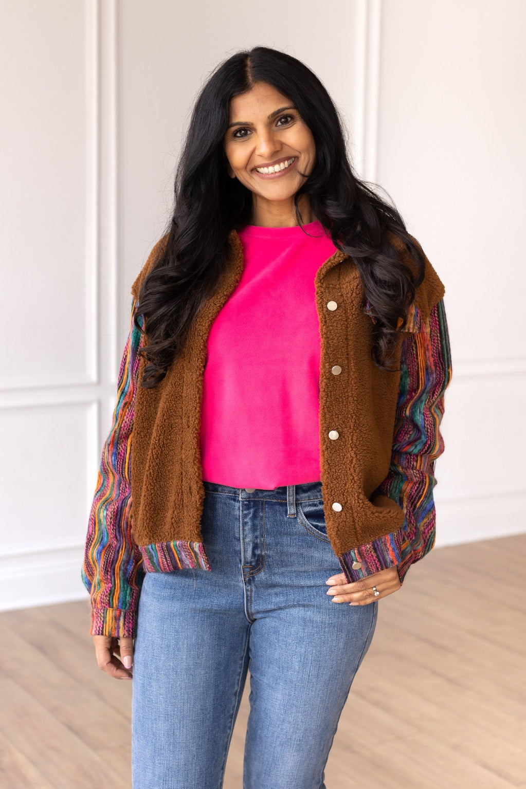Add a bold and cozy layer to your outfit with our Sherpa Reversible Zip Vest....