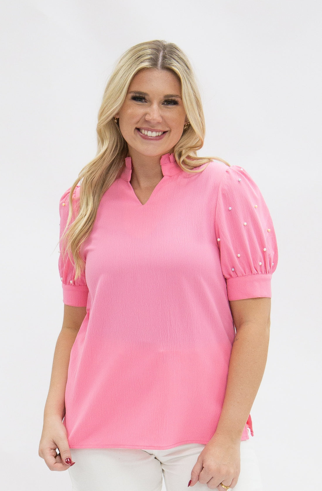 This pink puff sleeve top is a trendy and feminine piece, perfect for any wardrobe....