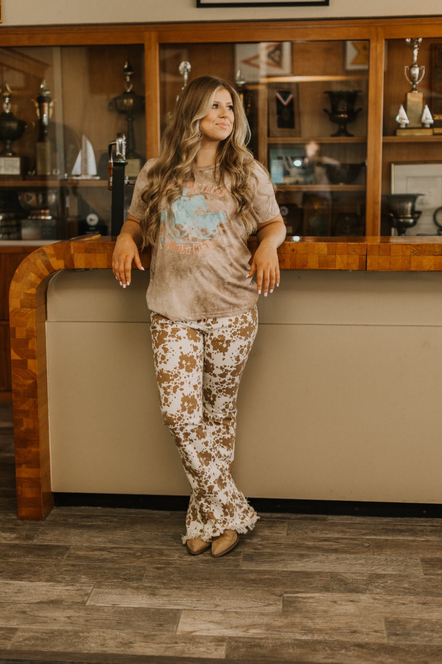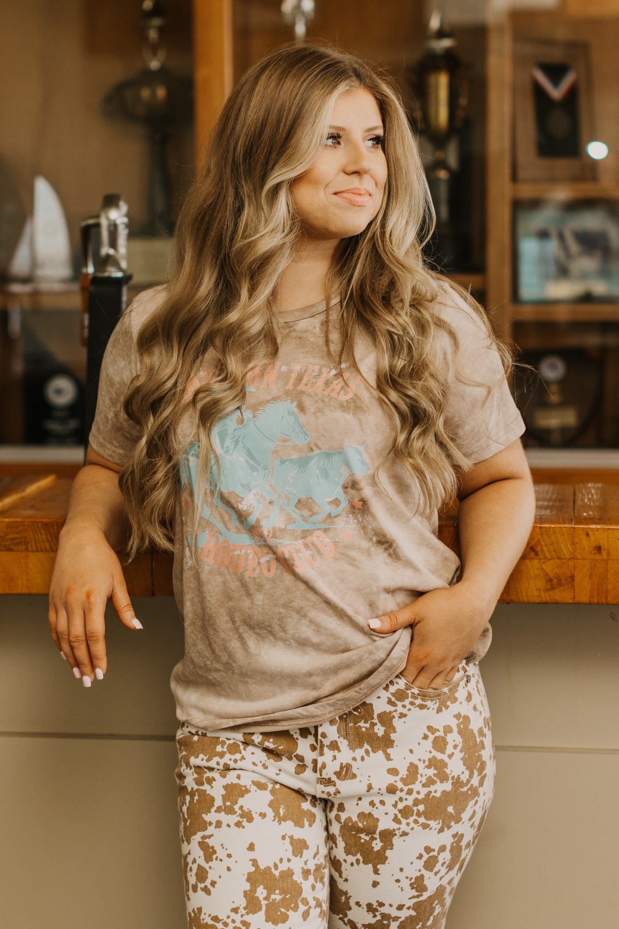 Celebrate the spirit of Texas with this classic graphic tee. Featuring a crew neckline and a standard T-shirt length, it's designed for easy, everyday wear. The slight stretch ensures a comfortable fit, while the unlined construction keeps it lightweight and versatile. Proudly printed in Texas, it's a perfect choice for adding a touch of rodeo charm to your wardrobe.