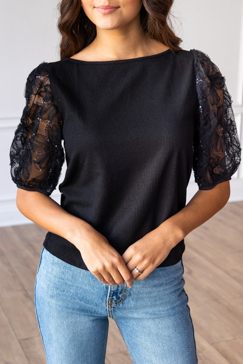 Midnight Blossom Black Sequins Floral Puff Sleeve
