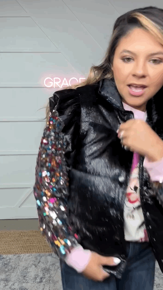 This FUN sparkly puffer vest is so awesome to dress up your jeans and shirt . I love that it has pockets and is way better in person .