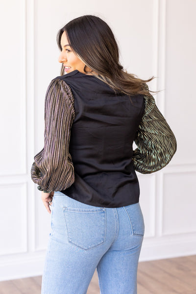 Glamour Gaze Black Top with Shimmer Sleeves