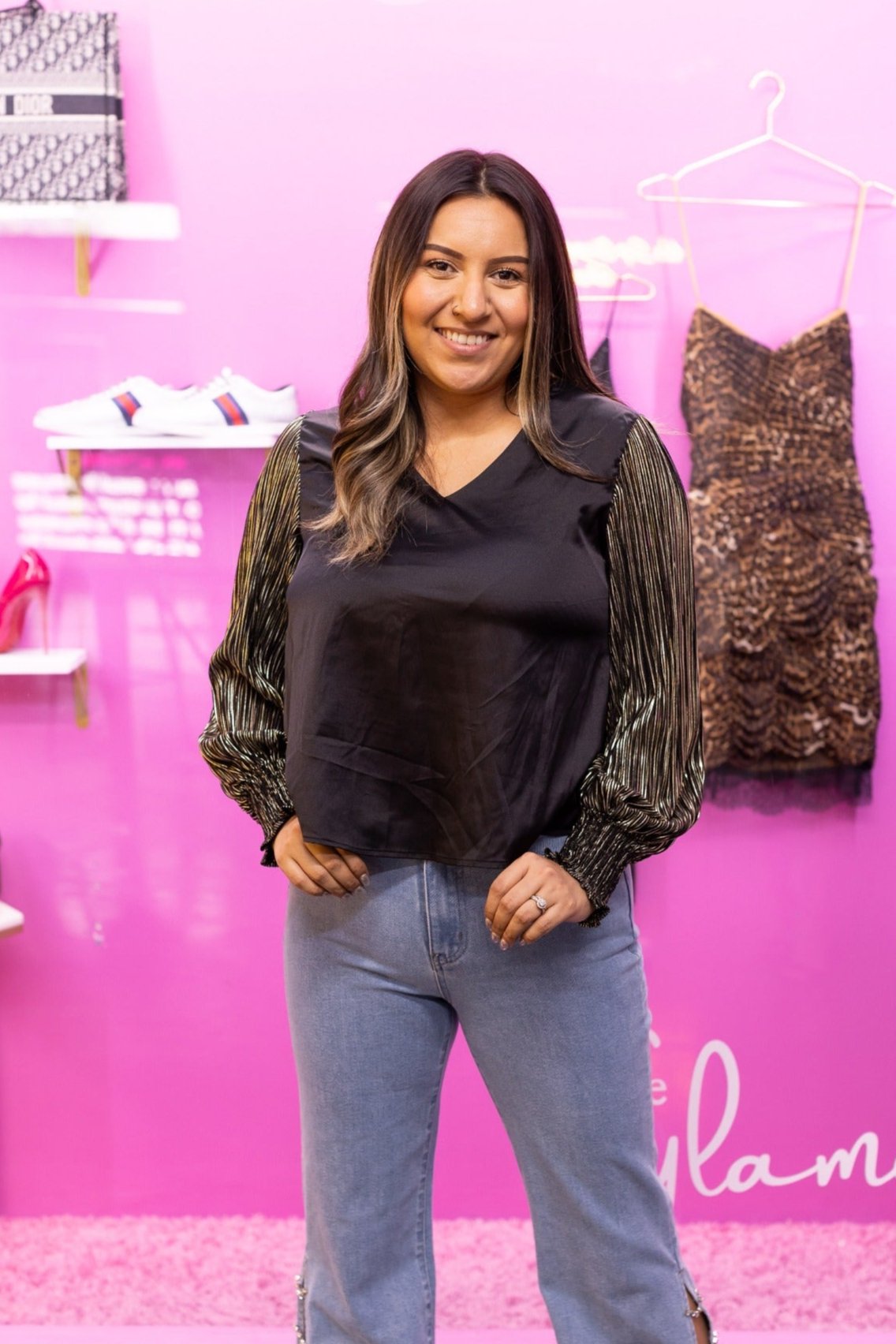 The shimmering sleeves add an element of opulence and allure to the rich black fabric. The subtle interplay between the deep hue and the sparkling sleeves creates a captivating effect, ensuring you command attention in any room. Whether you're attending a formal gala, a chic cocktail party, or a romantic dinner, this top exudes confidence and style.