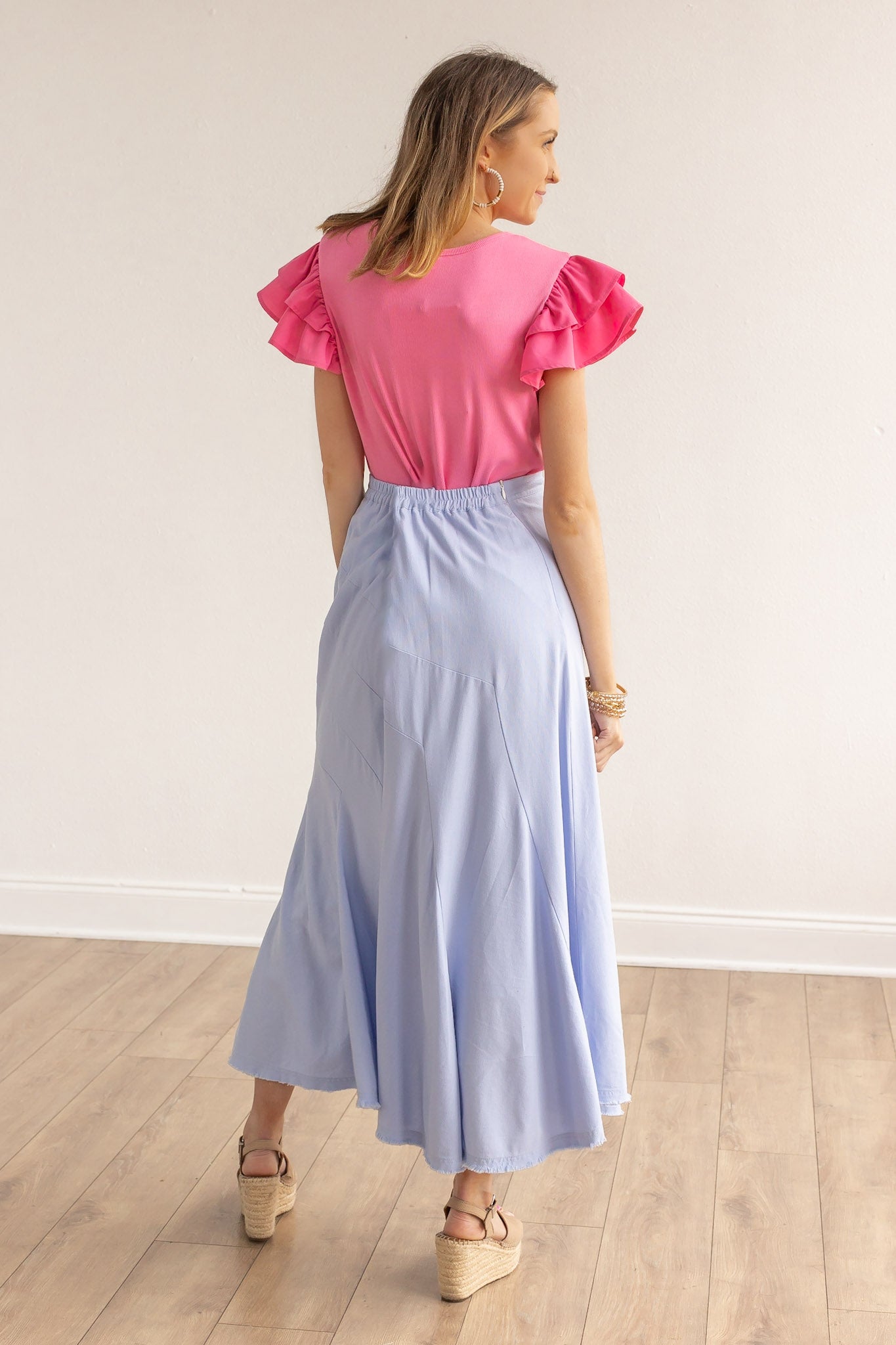 Discover versatility with our Blue Linen Versi Dress. This magical dress transforms an outfit in three different ways. Wear our beautiful piece as a traditional dress, or remove the shoulder straps from the button enclosure to reveal a stunning strapless look. Need another outfit? Turn that strapless dress into a skirt and add your favorite Grace+Emma graphic tee! Style and versatility... that's what we strive for!
