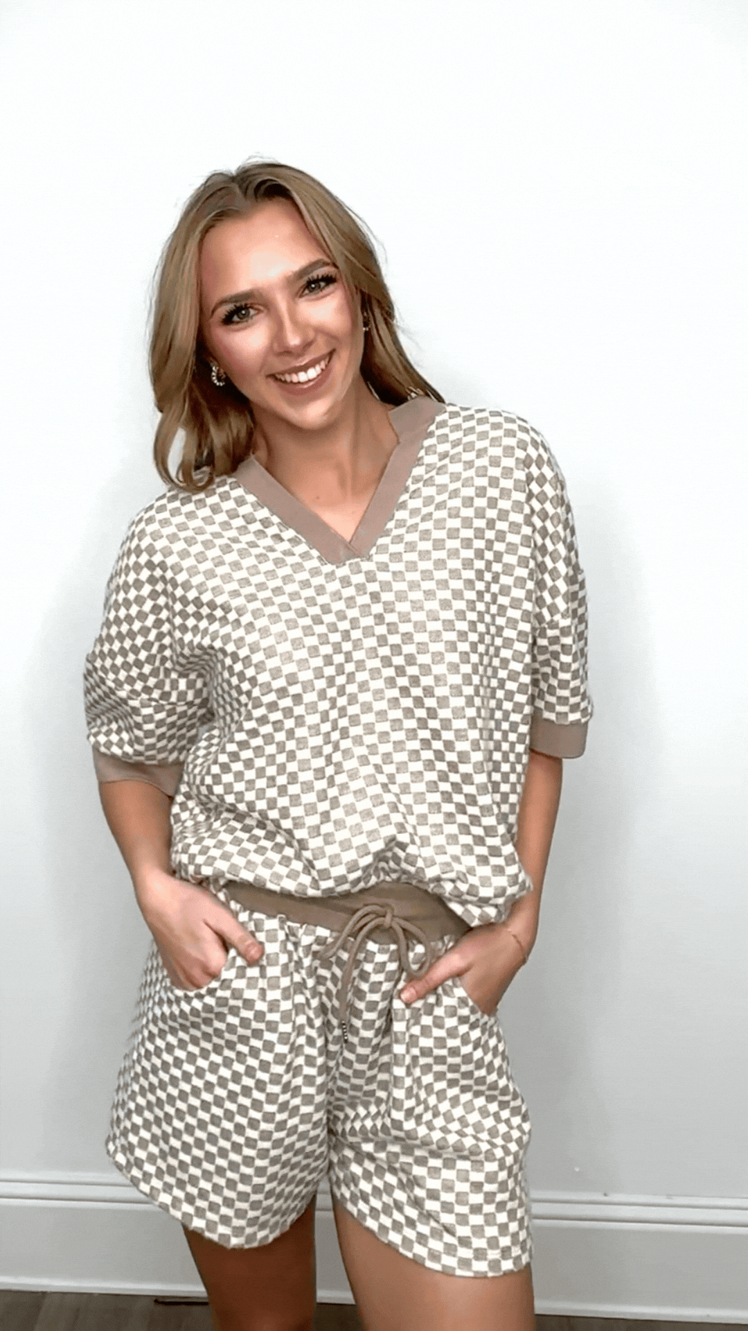 The Checkerboard Knit Shorts blend comfort and playful style effortlessly. Featuring a soft lining and slight stretch, they have a wide elastic waistband with an adjustable drawstring for a secure, customizable fit. Perfect for lounging or casual outings, these shorts offer a flattering and easygoing silhouette.