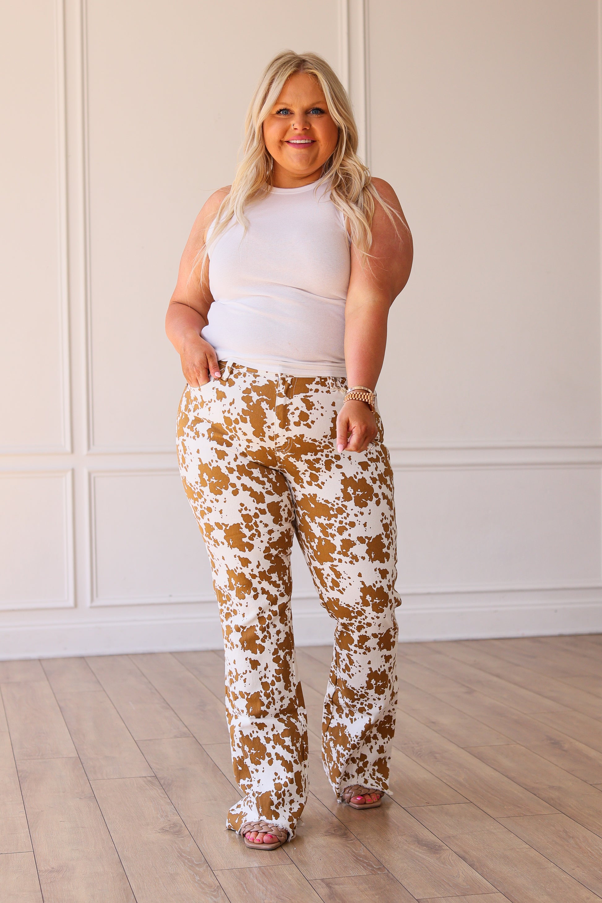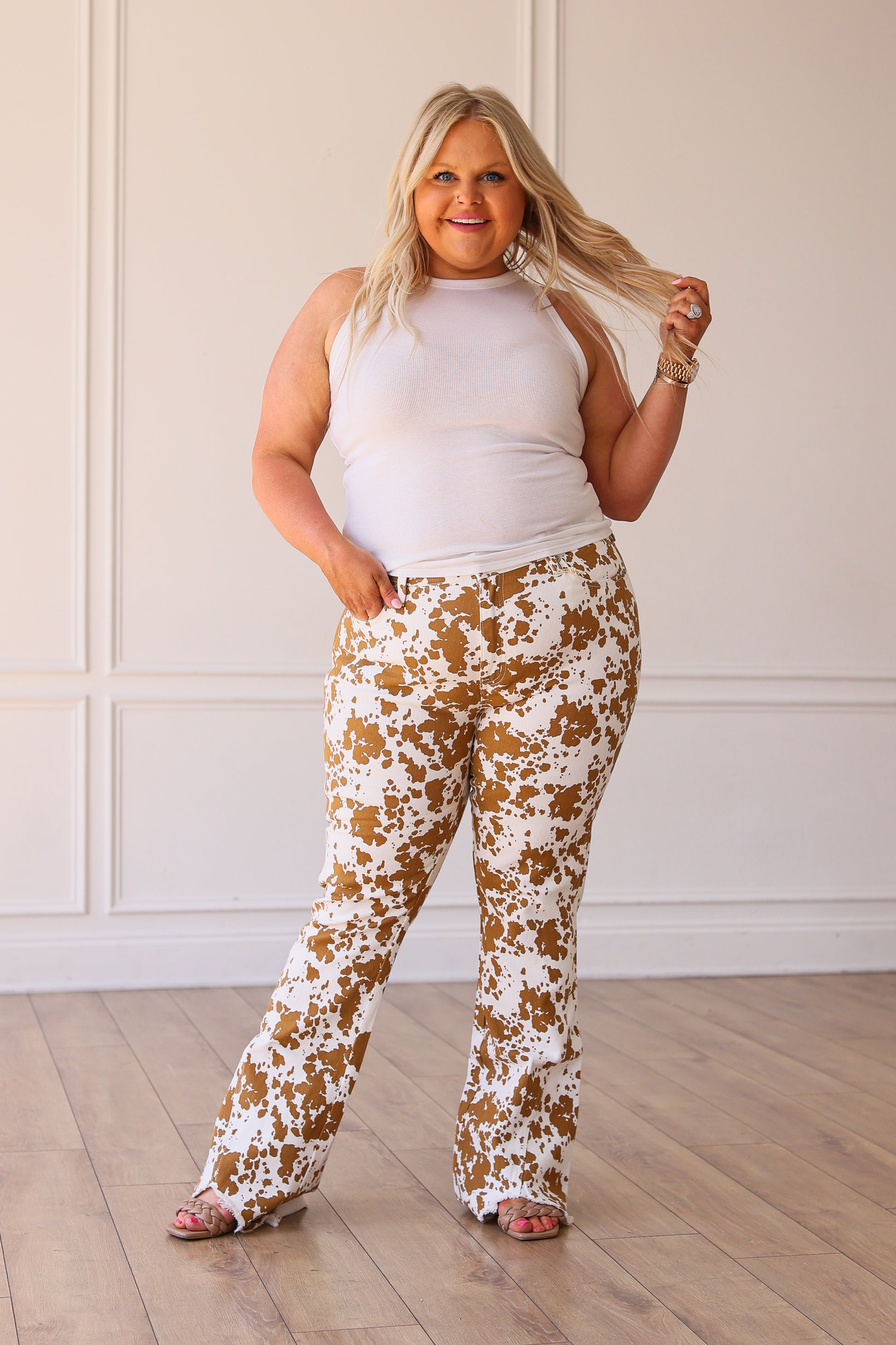 Introducing The Sadie Cowhide Flare With Fray Hem, a denim lover's dream come true. These jeans blend classic style with a contemporary twist, featuring a timeless cowhide pattern that's both eye-catching and versatile. The signature flare leg design adds a touch of vintage charm, while the fray hem offers a trendy, laid-back feel. Embrace a unique and fashionable denim look with The Sadie Cowhide Flare With Fray Hem, perfect for making a bold fashion statement with a touch of Western-inspired flair.