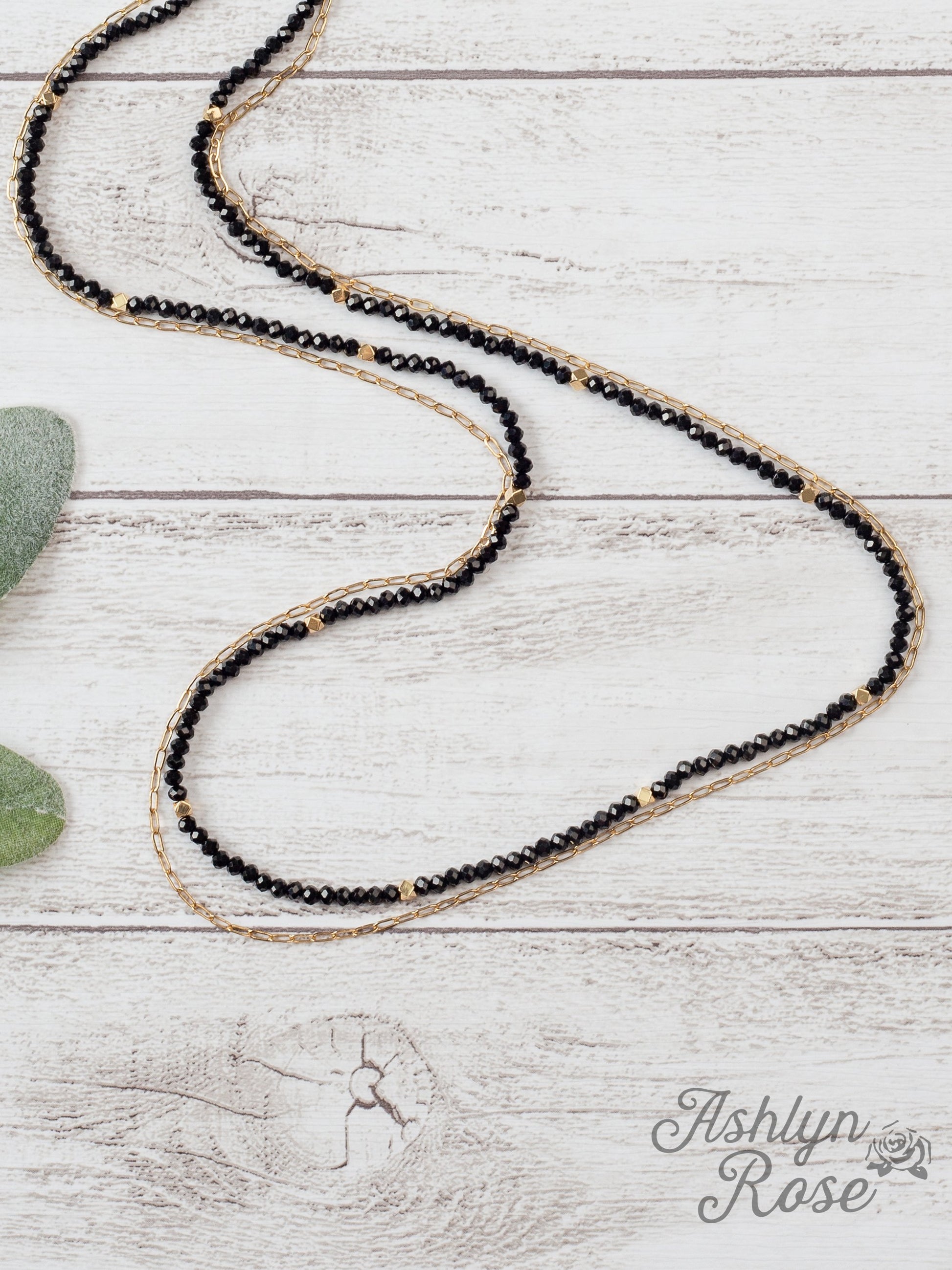 Glitz, Glam, Simple Strands Double Beaded Black Necklace with A Gold Chain