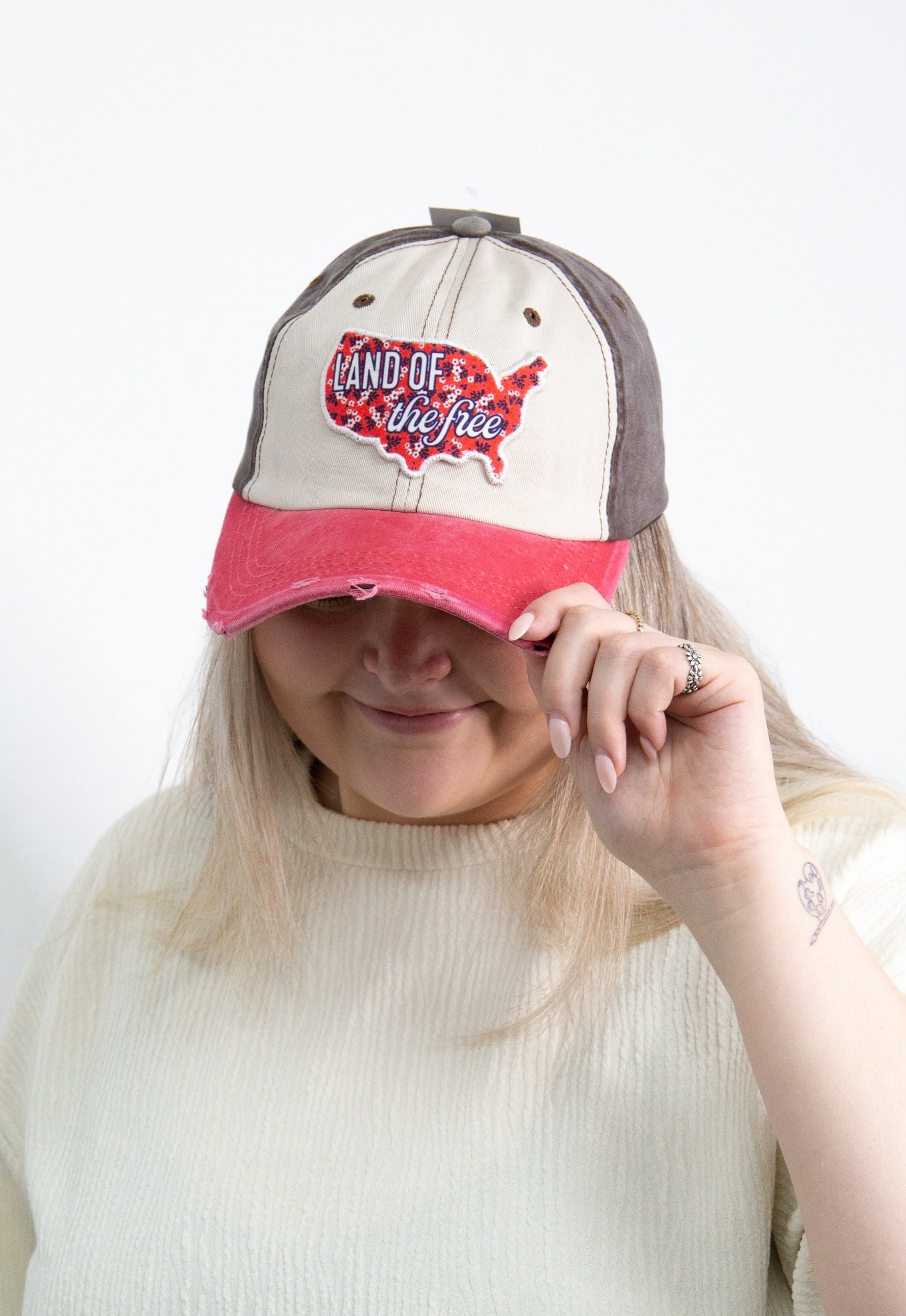 "Land of the Free" Patch on Tan, Brown and Red Hat