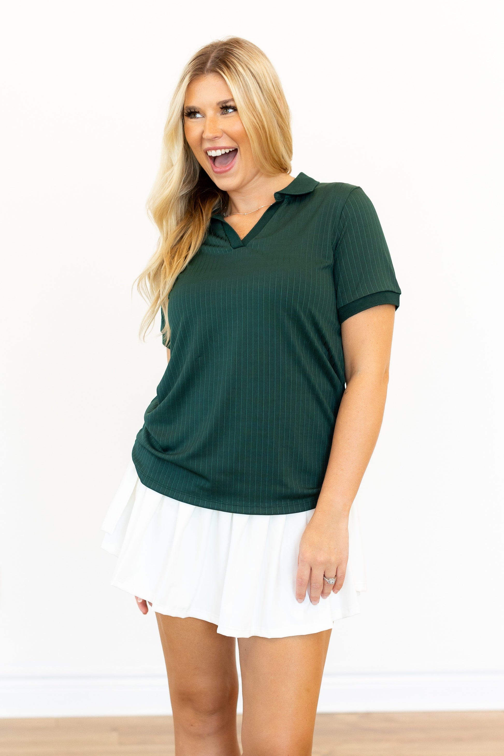 Refresh your everyday style with this Rib Knit Polo Top. Designed for a relaxed fit, it features a flattering V-neck and high-stretch fabric for comfort and ease of movement. The full-length design and moisture-wicking properties make it perfect for a stylish and fresh look anytime.