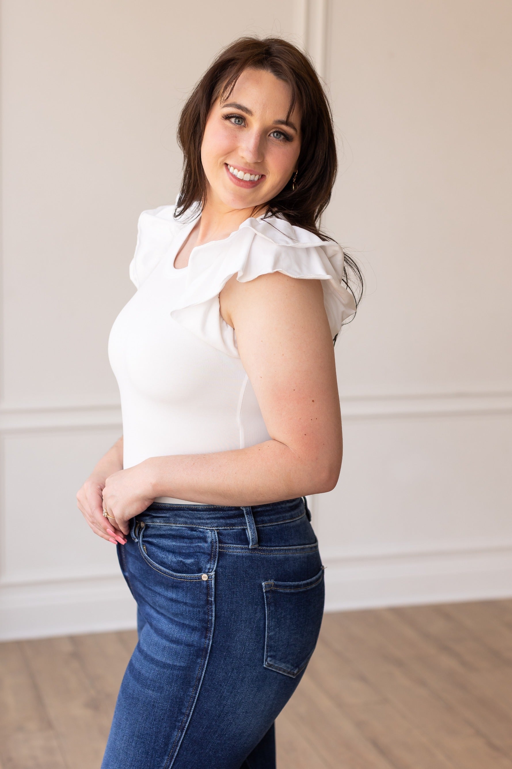 Look effortlessly chic in our Eloise Ruffle Sleeve Bodysuit in white. The delicate ruffles add a touch of feminine elegance to this already stunning piece. Made with high-quality materials, our bodysuit is comfortable to wear and will easily become a staple in your wardrobe. Pair it with your favorite high-waisted jeans or a statement skirt for a look that's both fashionable and versatile.