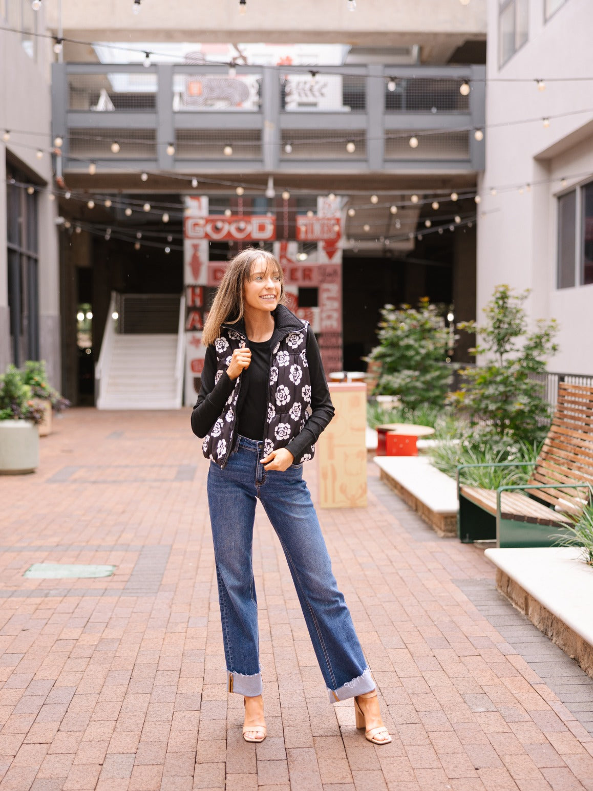 Switch up your style in seconds with The Gillian Reversible Puffer Vest. One side keeps it classic with a rich solid tone, while the other brings the fun with a bold floral print. Designed with a relaxed fit, light stretch, and full lining for warmth — plus front zip and pockets on both sides for added function. It's your go-to vest for layering and making a statement, whichever side you choose.