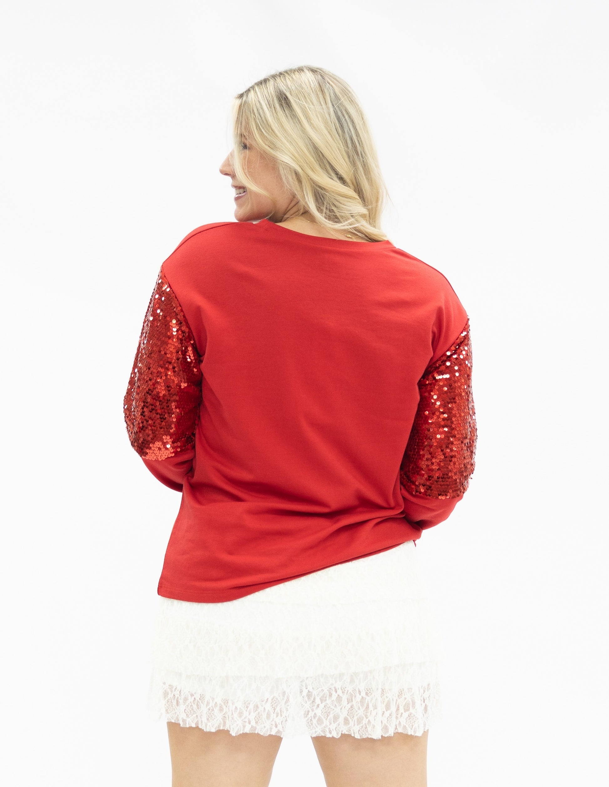 This lightweight French terry sweatshirt blends everyday comfort with a festive twist. Designed with high-stretch fabric for easy movement, it features sequin-accented sleeves lined on the inside to ensure a smooth, itch-free feel against the skin. The classic crew neckline and standard t-shirt length make it easy to wear solo or layered. Soft, breathable, and thoughtfully detailed, it's the perfect piece to add a little sparkle to your day without sacrificing comfort.